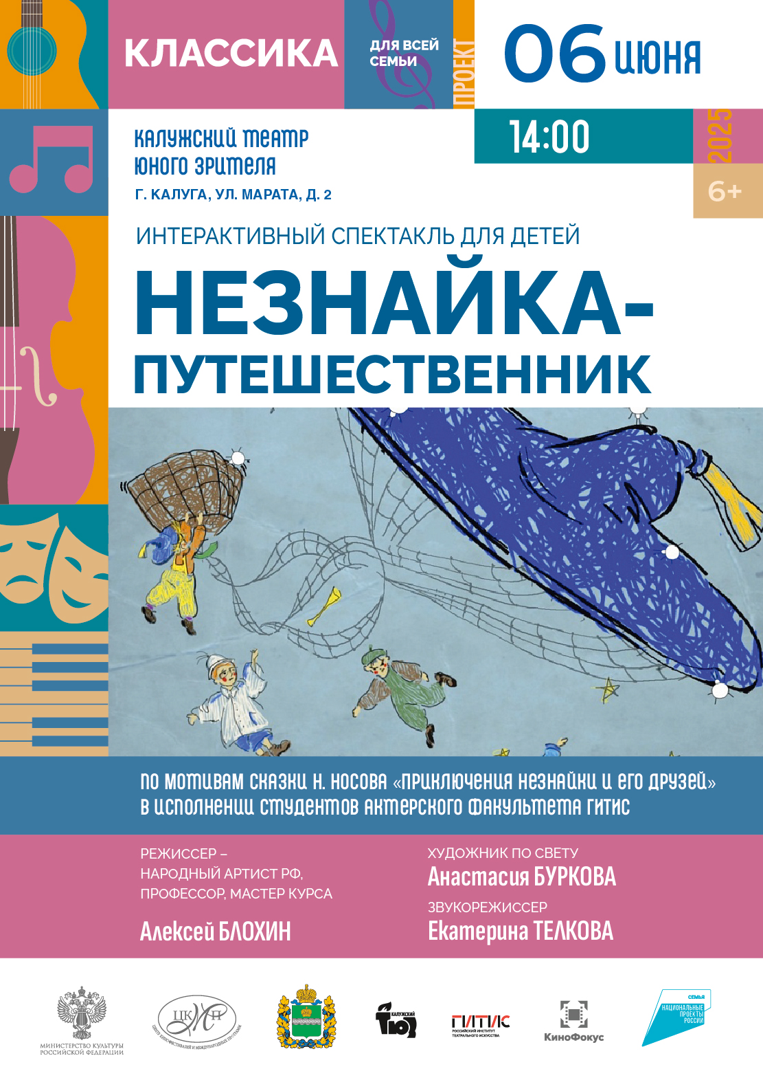 6 июня 2025 г. в 14:00 в Калужском театре юного зрителя будет показан интерактивный спектакль для детей «Незнайка-путешественник» с участием студентов актерского факультета ГИТИСа (мастерская Алексея Блохина).