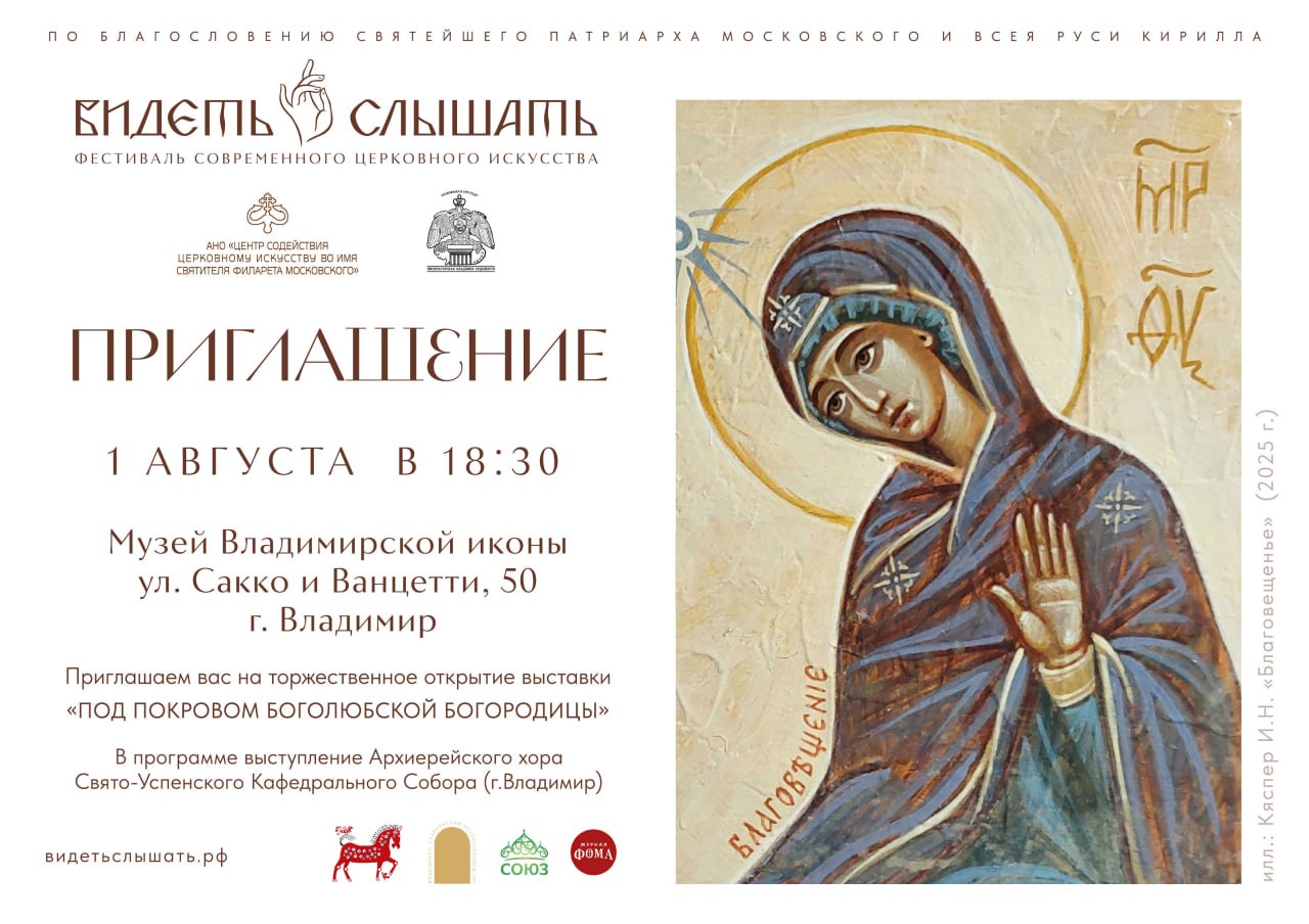 20250717_Видеть и слышать_Владимир.pdf Скачать файлОткрытие выставки современного церковного искусства «Под Покровом Боголюбской Богородицы» состоится 1 августа в Музее Владимирской иконы. Посетителям будут представлены работы современных художников-монументалистов и иконописцев, создающих священные образы и украшающих храмы Владимирской земли. Выставка продлится до 3 августа включительно.