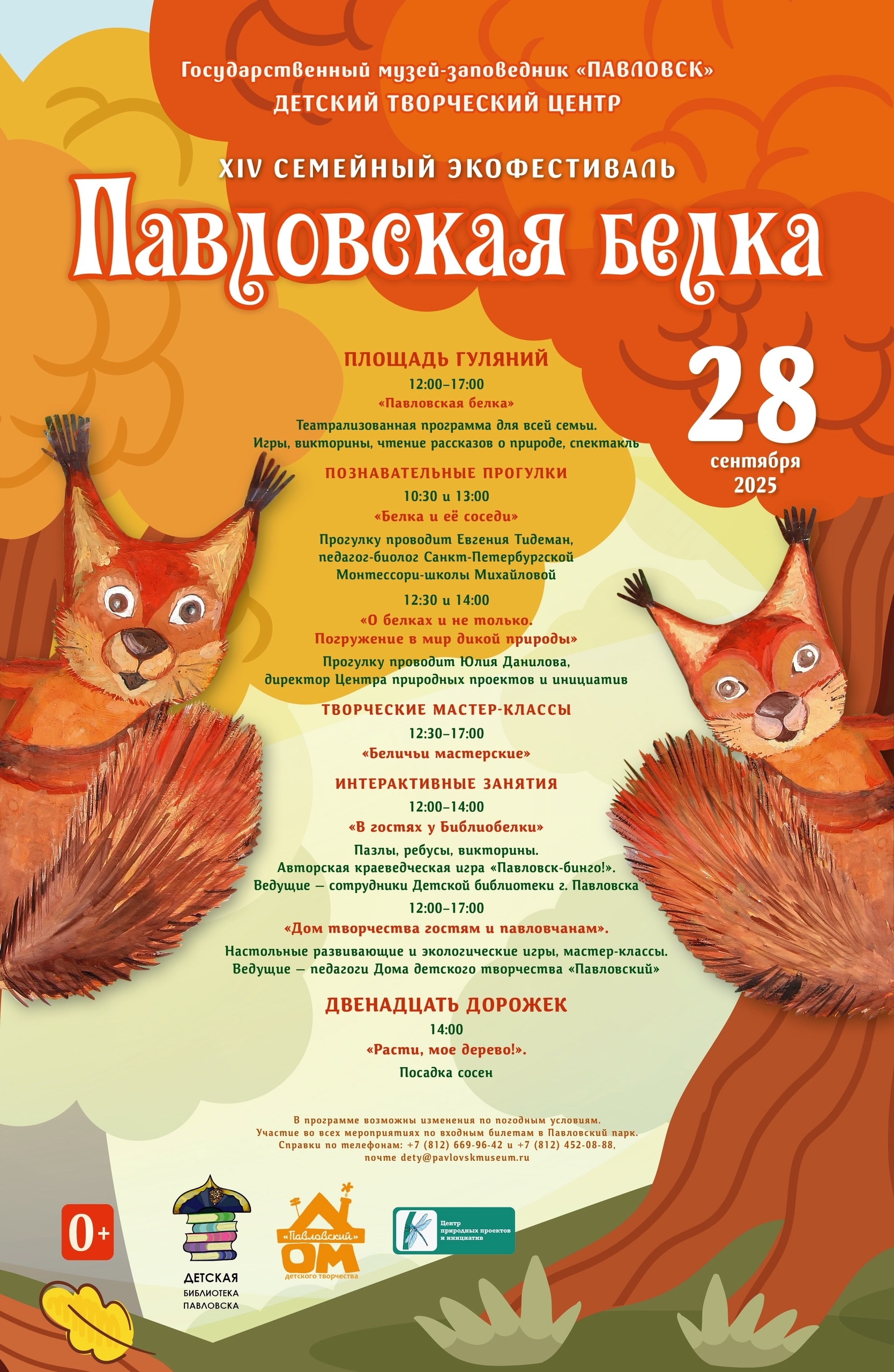 Хвостатые зверюшки посоветовались с пернатыми соседями, а также с сотрудниками музея-заповедника «Павловск», – и все вместе придумали программу фестиваля. Для самых любознательных предусмотрены познавательные экскурсии-знакомства с фауной и флорой Павловского парка: во время прогулки рекомендуется шуршать листвой и надеть самостоятельно сплетенный кленовый венок. Вдумчивые и внимательные встретятся с Библиобелкой и примут участие в викторинах и экологических играх. Творческим умельцам по душе будут интересные мастер-классы. И, конечно, все смогут стать участниками развлекательной программы.