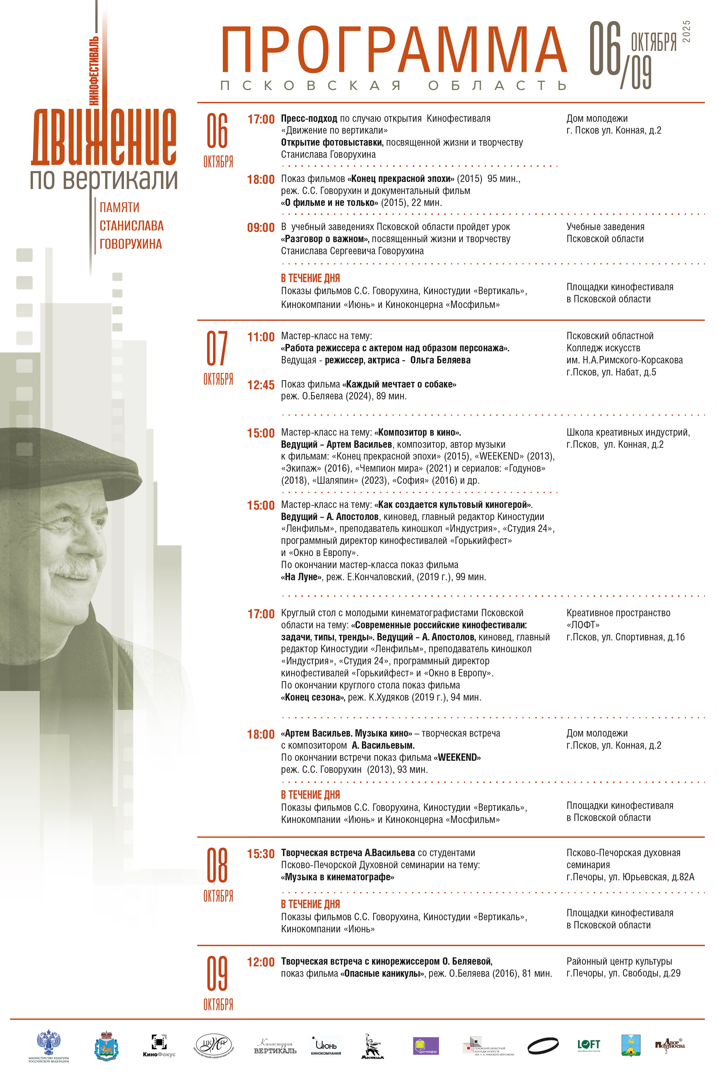 В рамках фестиваля планируются показы фильмов, творческие встречи и мастер-классы, которые способствуют развитию профессиональных навыков и творческого потенциала участников.