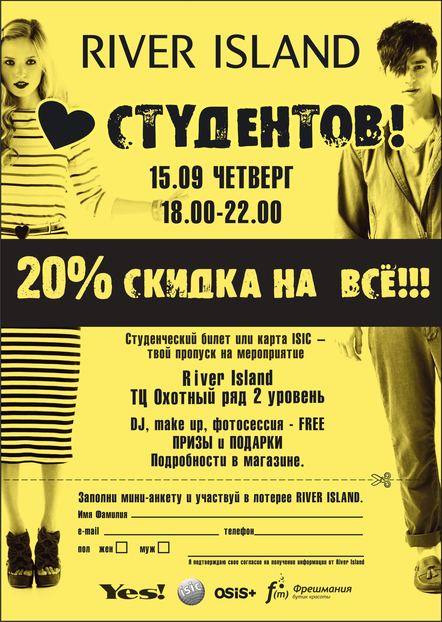 Присутствующих ждут призы и подарки от RIVER ISLAND и наших партнеров - международной карты ISIC, журнала YES!, салонов красоты Фрешмания - и самое главное,