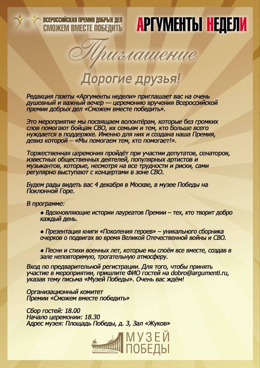 Премия объединяет неравнодушных россиян уже более десяти лет. В центре внимания в этом году волонтёры, занимающиеся доставкой гуманитарной помощи в зону проведения спецоперации, а также деятели культуры, своим творчеством и личным участием поддерживающие наших бойцов. Награды получат активисты из разных уголков страны – от Махачкалы и Углича до Чукотки. В числе тех, кого будут чествовать в этот вечер, – певица Таисия Повалий, которая своими выступлениями придаёт силы защитникам Отечества.