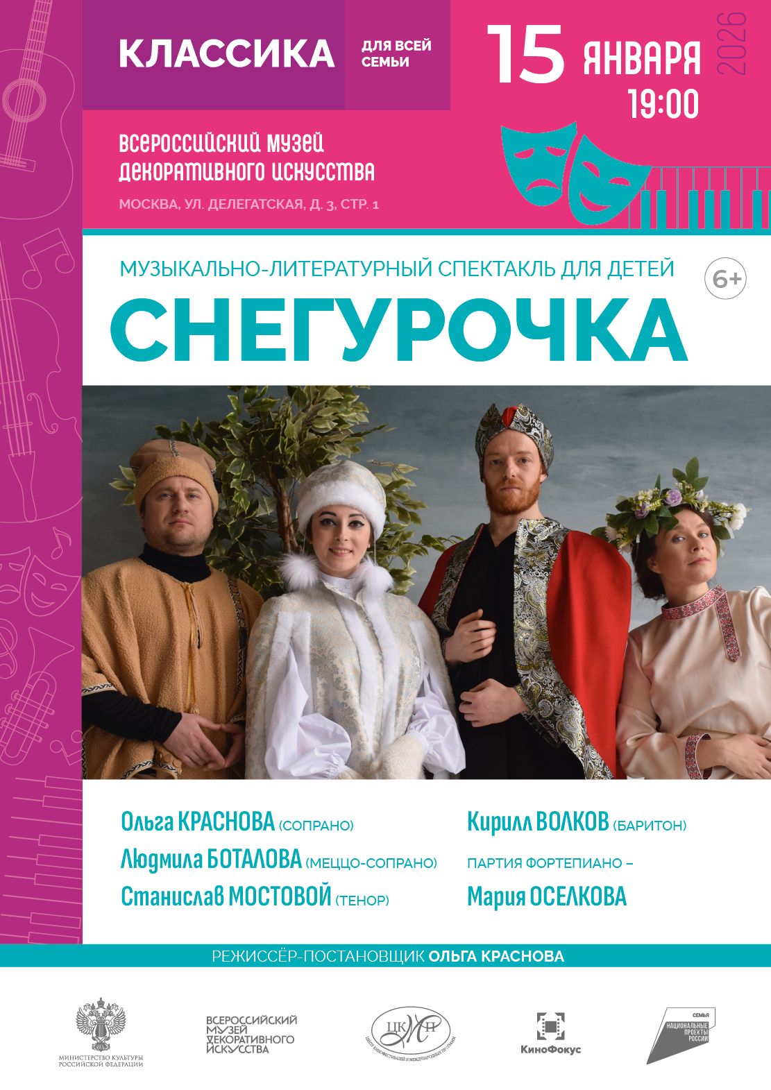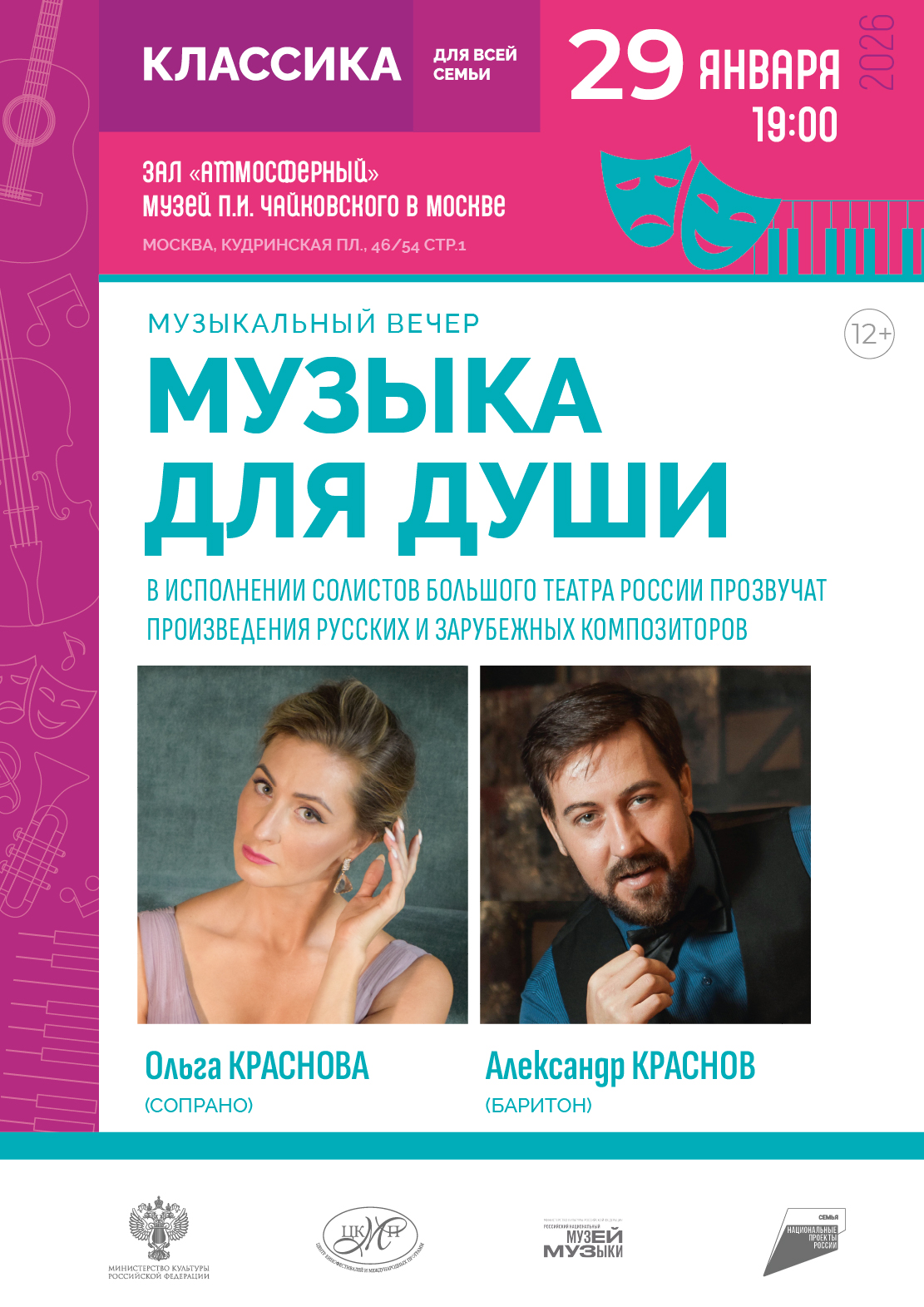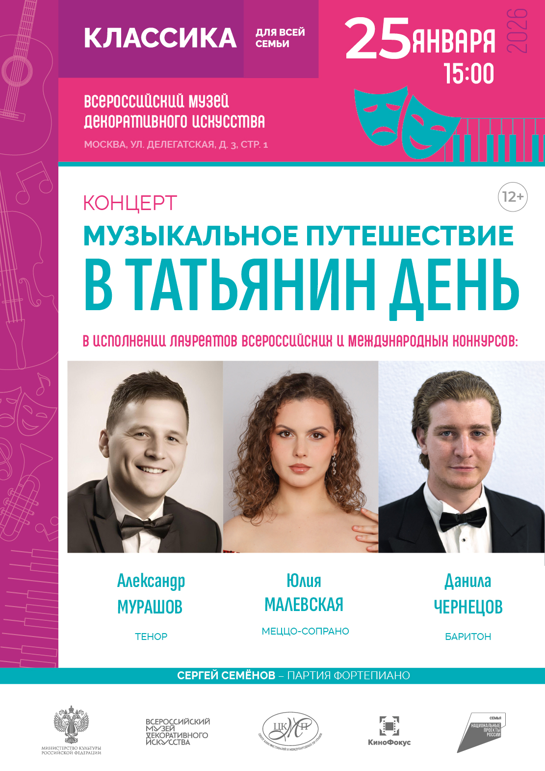 Программа мероприятий открывается 15 января в 19:00 на сцене Всероссийского музея декоративного искусства музыкально-литературным спектаклем для детей «Снегурочка». 25 января в 15:00 во Всероссийском музее декоративного искусства пройдет праздничный концерт «Музыкальное путешествие в Татьянин день». А 29 января в 19:00 в зале «Атмосферный» Музея П.И. Чайковского в Москве состоится музыкальный вечер «Музыка для души».