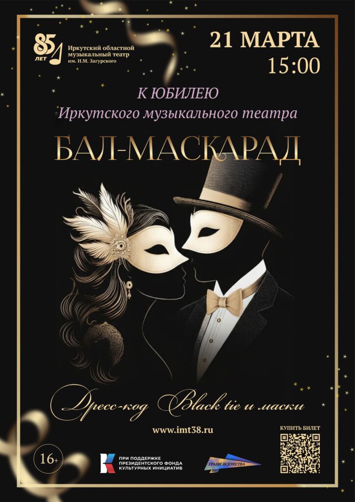 Бал-маскарад проходит в рамках реализации проекта «Сезоны вдохновения» при поддержке Президентского фонда культурных инициатив к 85-летию Иркутского областного музыкального театра им. Н. М. Загурского.