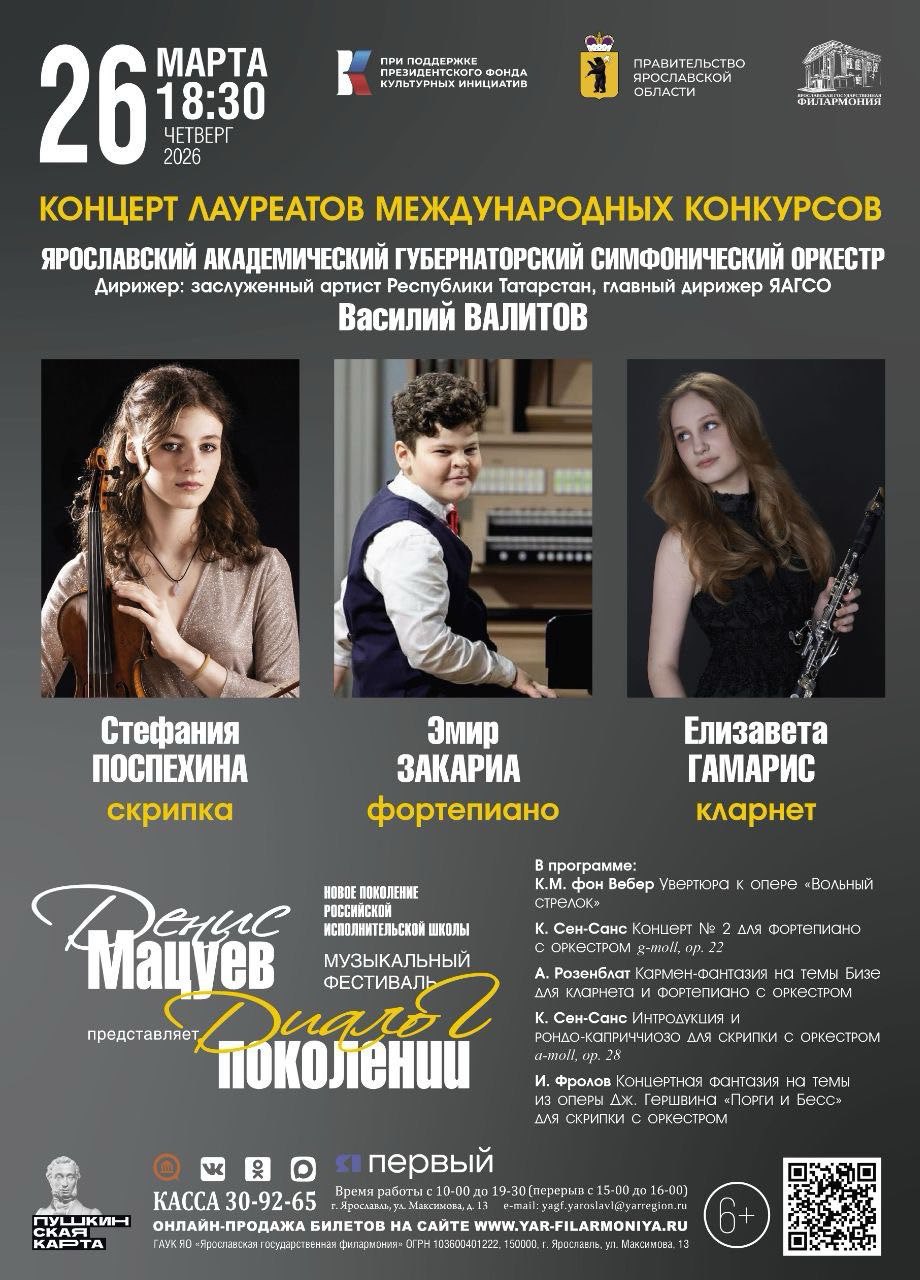 Фестиваль «Диалог поколений» открывает российским слушателям имена ярчайших молодых солистов, громко заявившим о себе на самых значимых международных состязаниях. В Ярославле на сцене Концертного зала имени Леонида Собинова Ярославской государственной филармонии состоится Концерт лауреатов международных конкурсов: обладательницы Гран-При I Конкурса молодых исполнителей «Симфония-Ямала», Международного юношеского конкурса им. П.И. Чайковского Стефании Поспехиной (скрипка), лауреата Международного телевизионного конкурса юных музыкантов «Щелкунчик» Елизаветы Гамарис (кларнет), лауреата Международного юношеского конкурса им. П.И. Чайковского, победителя Международного телевизионного конкурса юных музыкантов «Щелкунчик» и Всероссийского конкурса юных талантов «Синяя птица» Эмира Закарии (фортепиано).