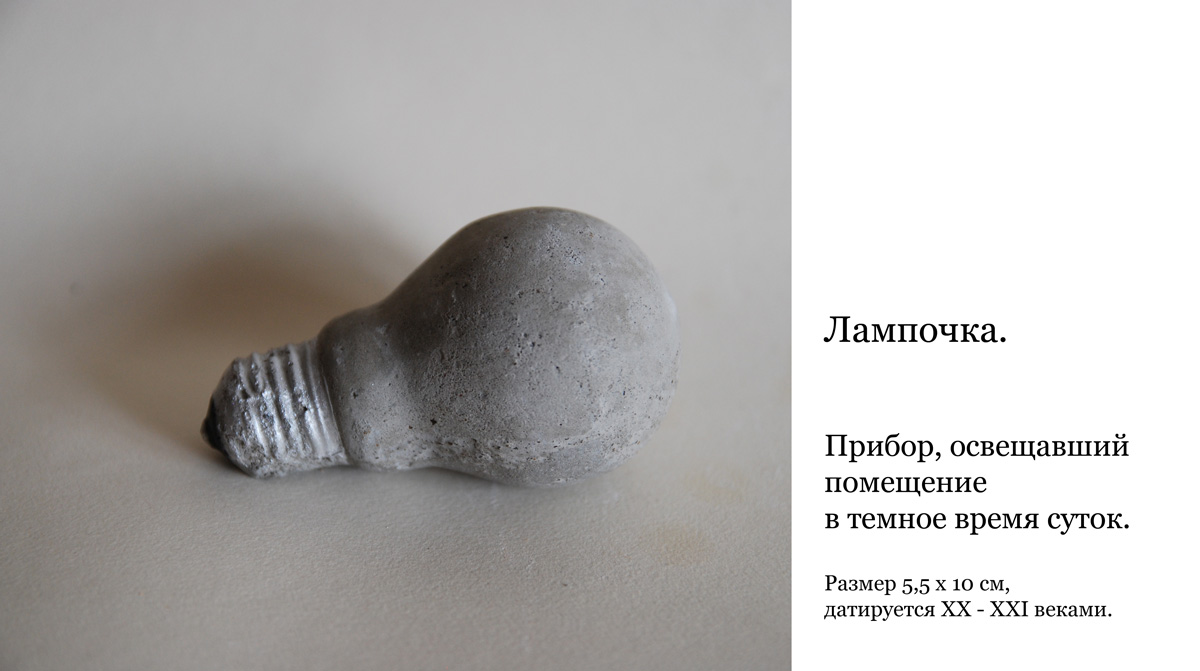 В процессе проведения земельных работ, неожиданно были найдены некие окаменелости явно антропогенного происхождения. Дальнейшие раскопки показали, что с большой вероятностью на значительной территории залегает целая окаменевшая цивилизация. Ведутся работы по расшифровке найденных текстов и рисунков, но уже сейчас мы можем датировать находки началом III тысячелетия. Впервые было найдено такое количество памятников новой для нас культуры. Проделан большой объем работ по атрибуции находок. На основании наших выводов о повседневной, обыденной жизни человека того времени мы заключаем, что не все находки имели практическое назначение, скорее всего многие из них имели культовую ценность. Однако, назначение некоторых предметов нам не всегда полностью ясно. Характер повреждений найденных вещей в основном связан с их назначением и лишь отчасти с природным воздействием. Мы составили данную экспозицию из наиболее интересных находок.