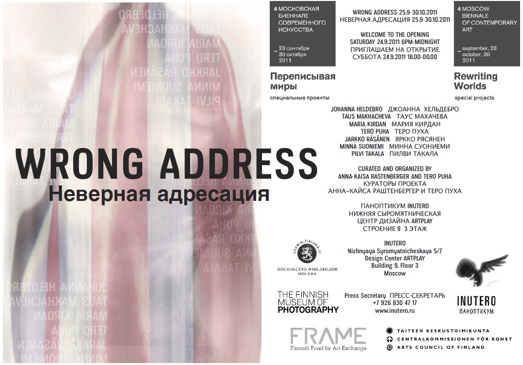 "Неверная адресация" – один из специальных проектов Четвертой Московской Биеннале Современного Искусства, куратором которого является Анна-Кайса Растенбргер , старший куратор Финского Музея Фотографии. Экспозиция будет представлять из себя остроумный и органичный сплав работ семи художников, объединенных темой «нахождения не по адресу» и «путешествия в неверном направлении». Осознание простого факта, что все мы порой оказываемся не на своем месте, "не по адресу", подразумевает не просто признание этого факта, но и переоценку своей системы ценностей для нахождения нового пути, продолжение поиска.