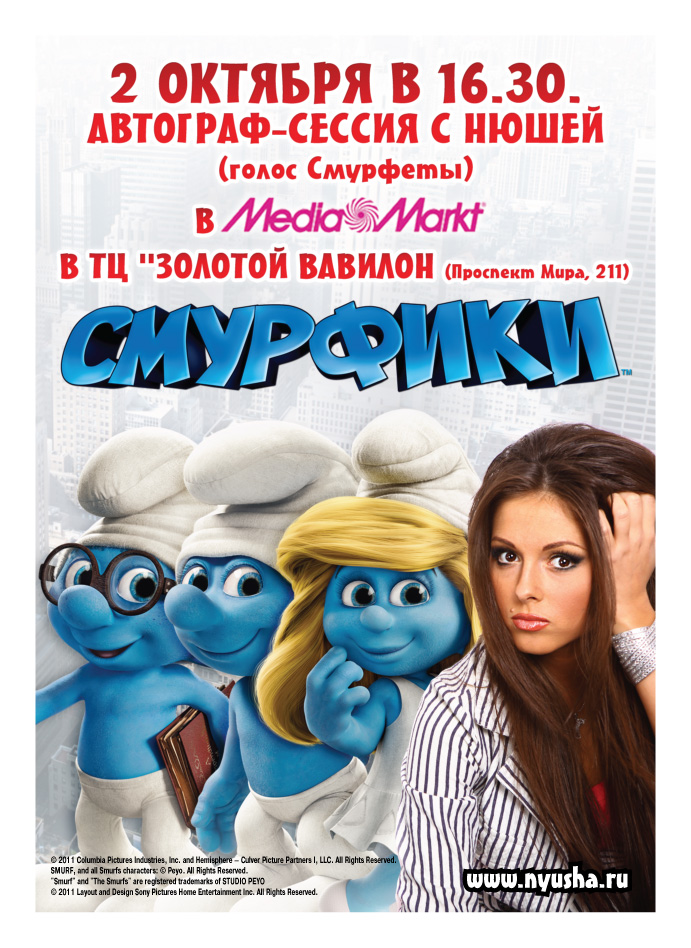 Автограф-сессия приурочена к выходу на DVD фильма «Смурфики», в котором Нюша озвучила одну из главных героинь – Смурфету.