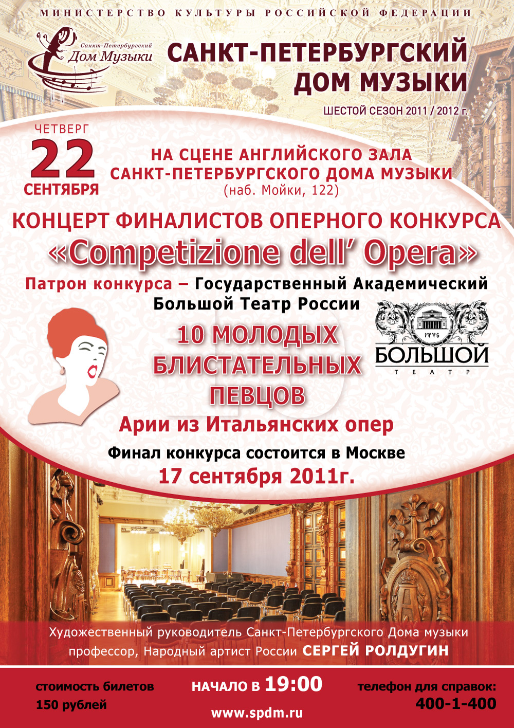 В этом году конкурс проходил под патронатом Большого театра, где 17 сентября 2011г. и состоялся финал. Лауреатами, обладателями трех первых премий конкурса стали певцы из России - баритон Роман Бурденко из Петербурга (I премия), баритон Игорь Головатенко (II премия), бас Михаил Коробейников (III премия). В Петербург они прилетят прямо из Екатеринбурга, где накануне выступят с той же программой. Концерт станет настоящей певческой эстафетой: кроме победителей выступят остальные 10 финалистов Competizione dell' Opera (4 певца, 6 певиц). Каждый исполнит по одной из знаменитых арий.