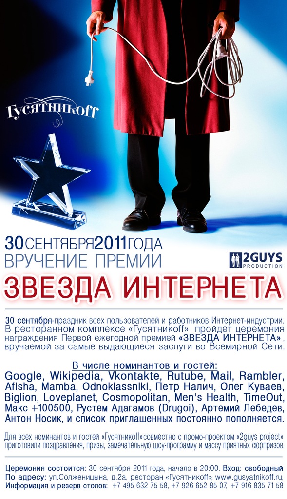 В Гусятникове пройдет церемония награждения Первой ежегодной премии "ЗВЕЗДА ИНТЕРНЕТА", вручаемой за самые выдающиеся заслуги во Всемирной Сети.