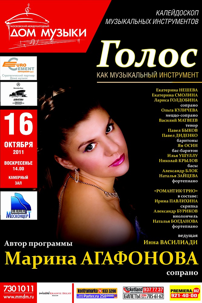 Марина Агафонова (сопрано), Екатерина Нешева, Екатерина Смолина, Лариса Голдобина (сопрано), Ольга Куличева (меццо-сопрано), Василий Матвеев (тенор), Павел Быков (баритон), Павел Диденко (баритон), Ян Осин (бас-баритон), Илья Ушшулу (бас), Николай Крылов (бас), Александр Блок, Наталья Зайцева (фортепиано), Романтик-ТРИО. Ведущая Инна Василиади.