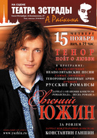 15 ноября 2012 года на сцене легендарного Театра эстрады им.А.Райкина состоится сольный концерт лауреата международных конкурсов, Победителя международного конкурса «Романсиада», «Весна романса», молодого тенора Евгения ЮЖИНА. На протяжении трёх сезонов петербургский артист спел более 100 сольных концертов по всей России: от Калининграда до Южно-Сахалинска. А нынче споёт о Любви самые известные произведения для тенора в родном и любимом городе на сцене прославленного концертного зала.