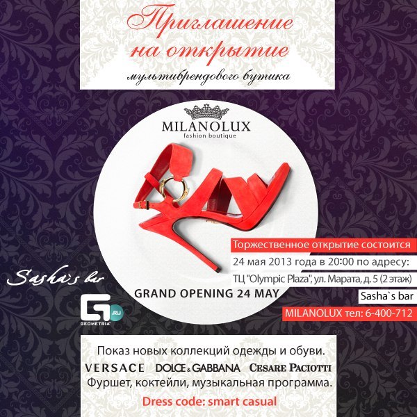 24 мая вас будет ждать презентация бутика Milanolux, модный показ в Sasha’s Bar – партнере открытия, а также фуршет и welcome drink для всех гостей.