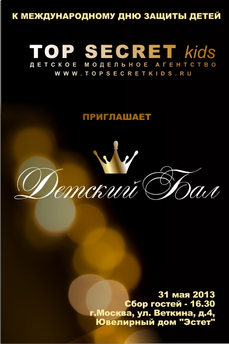 Детское модельное агентство TOP SECRET kids при содействии Общероссийской Общественной Организацией «ОФИЦЕРЫ РОССИИ», Всероссийского общественного движения «Матери России» и Ювелирного дома «Эстет» приглашают на яркое событие в мире детской моды - «Детский Бал». Светское мероприятие приурочено к празднованию Международного Дня Защиты Детей.
