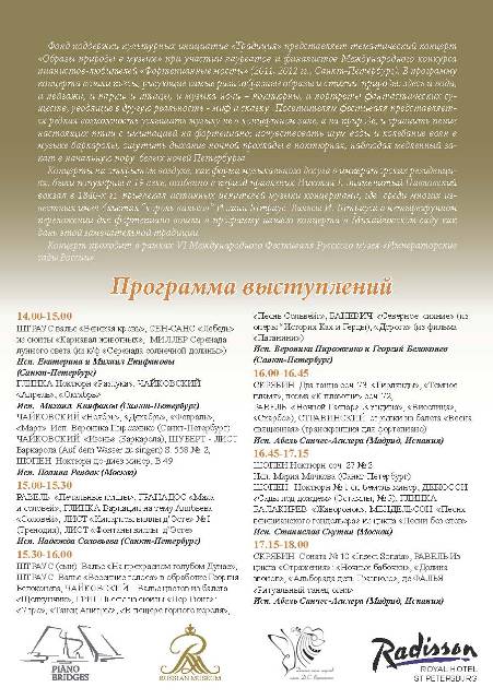 Концерт пройдет в рамках 6-го Международного фестиваля Русского музея "Императорские сады России" в воскресенье, 9 июня 2013 г. с 14.00 по 18.00 в Михайловском саду на Берме Михайловского дворца.