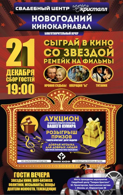 Вечером 21 декабря на сцене «Кристалла» извеcтные всей стране люди отойдут от привычных амплуа и предстанут в образах Шурочки и Лиды из «Приключений Шурика», Нади и Жени из «Иронии судьбы» и даже споют легендарную «My heart will go on» на корме «Титаника»! Править балом будут ведущие – звезды сериала «Универ» Алексей Гаврилов и Лариса Баранова. В рамках нашего кинокарнавала мы, совместно с благотворительным фондом «Линия Жизни», проведем и «звездный» аукцион. Среди звезд приглашенных звездных гостей ожидаются Митя Фомин, Екатерина Волкова (звезда сериалы "Воронины"), Анна Хилькевич, Лянка Грыу, Артем Королев, Эвелина Бледанс, Ляйсан Утяшева, Анастасия Гребенкина, Настя Задорожная, Иван Николаев и Яна Лапутина. Приглашенные знаменитости, принесут с собой оригинальные личные вещи. И все, что удастся выручить от продажи звездных лотов будет передано на оплату высокотехнологичной операции Анастасии Лапухиной 2009 г.р. У Насти диагностирован врожденный порок сердца и ей требуется операция по коррекции порока с использованием спирали. Стоимость необходимых инструментов — 65.050 рублей. Операция планируется в Кировской областной клинической больнице.