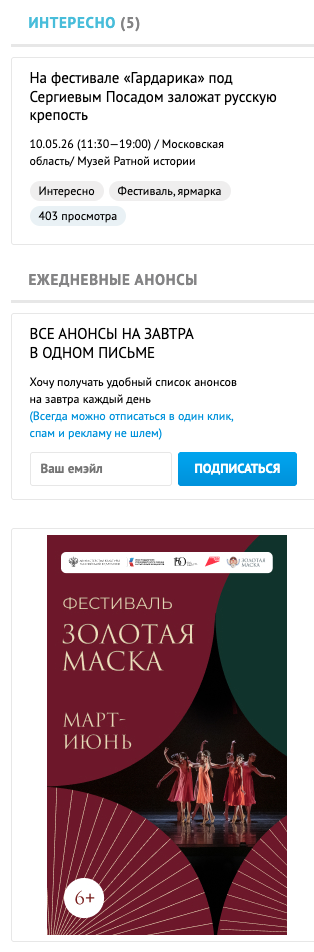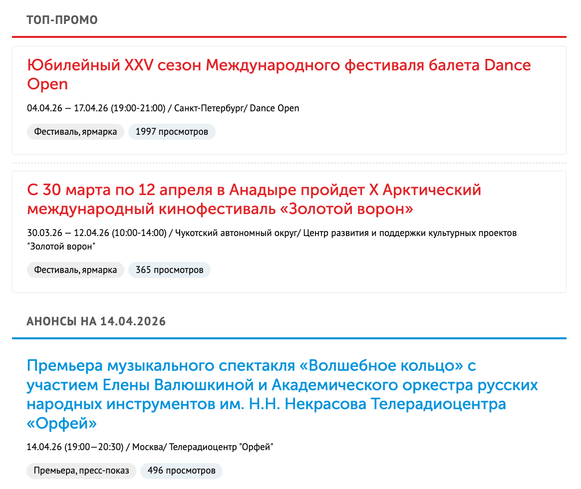 — Размещение анонса в блок «Топ-промо». Информация о мероприятии будет закреплена над другими анонсами дня, выделена цветом и специальной рамкой.