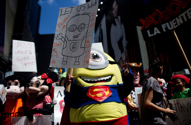 На Таймс-сквер прошла акция протеста, вызвавшая ажиотажный интерес журналистов. Им удалось взять интервью у Золушки, задать вопрос Бэтмену и получить комментарий от ковбоя Вуди, сообщает The New York Times. Несколько десятков уличных артистов, одетых в костюмы популярных героев кино и мультфильмов вышли на забастовку.