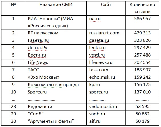 Для сравнительного анализа ниже приведены Топ-СМИ из уже упомянутого исследования «Рейтинг цитируемости российских СМИ», а также лидеры из «Рейтинга цитируемости русскоязычных блогеров».