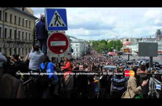 Рекламное сообщество отреагировало на вступившие поправки в закон о митингах, предусматривающие значительные денежные штрафы для участников протестных акций. В сети появился быстро набирающий популярность видеоролик, обыгрывающий в сатирическом ключе рекламную концепцию бренда MasterCard применительно к новым российским политическим реалиям.