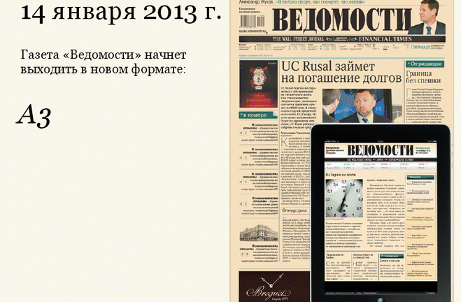14 января одна из ведущих российских деловых газет - «Ведомости» - вышла в новом печатном формате. Размер издания уменьшился с A2 до A3, при этом количество полос увеличилось вдвое, как и было анонсировано в ноябре прошлого года в редакционном блоге.
