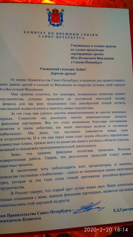 20 февраля в Санкт-Петербурге в отеле «Амбассадор» прошёл Международный семинар по развитию туризма совместно с представителями туристской сферы приграничных городов Финляндии (Иматра, Лаппеенранта, Миккели, Савонлинна, Коувола и Хамина).