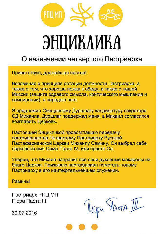 30 июля 2016 года Пастриарх РПЦ Пюра Паста III издал Энциклику "О назначении четвертого Пастриарха". Новым Пастриархом РПЦ стал Сама Паста IV (Михаил Самин, член Священного Дуршлага). Пастриарх Пюра Паста III перешел в статус Пастриарха на покое.